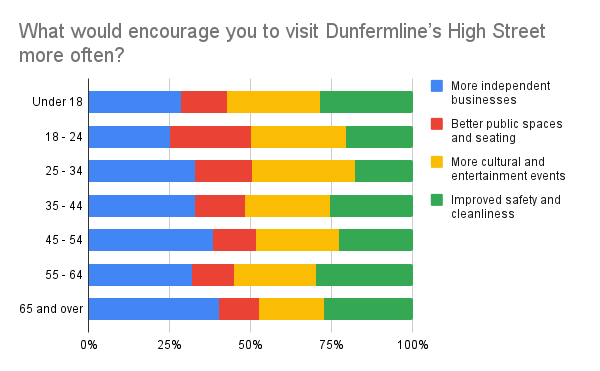 The open-text “other” responses have been grouped into themes. While fewer in number, they still point to practical improvements that people feel would make a difference. Suggestions included more family-friendly spaces, better public seating and toilets, improved accessibility for those with mobility needs, and more evening activities to keep the High Street lively after dark.