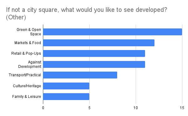As well as the predefined choices, respondents could select 'other' to suggest their own ideas as to how the gap-site could be developed. Out of the 67 open text responses, we categorised those into clear themes.