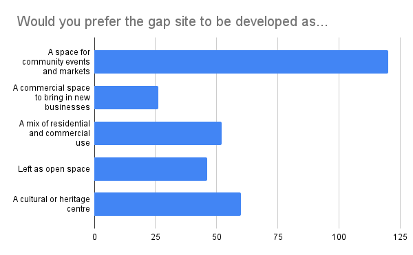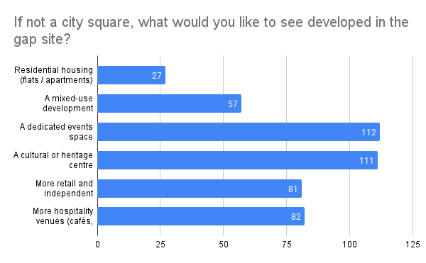 Responses showed a wide range of alternative ideas, with many calling for a cultural or heritage space, a food court or market hall, or independent shops and mixed-use development combining business and housing. Others suggested creating more green space in the town centre, while a smaller group felt the site should simply be left alone or money spent elsewhere. Overall, the results highlight that many people see the gap site as a chance for something more ambitious than a small square.
